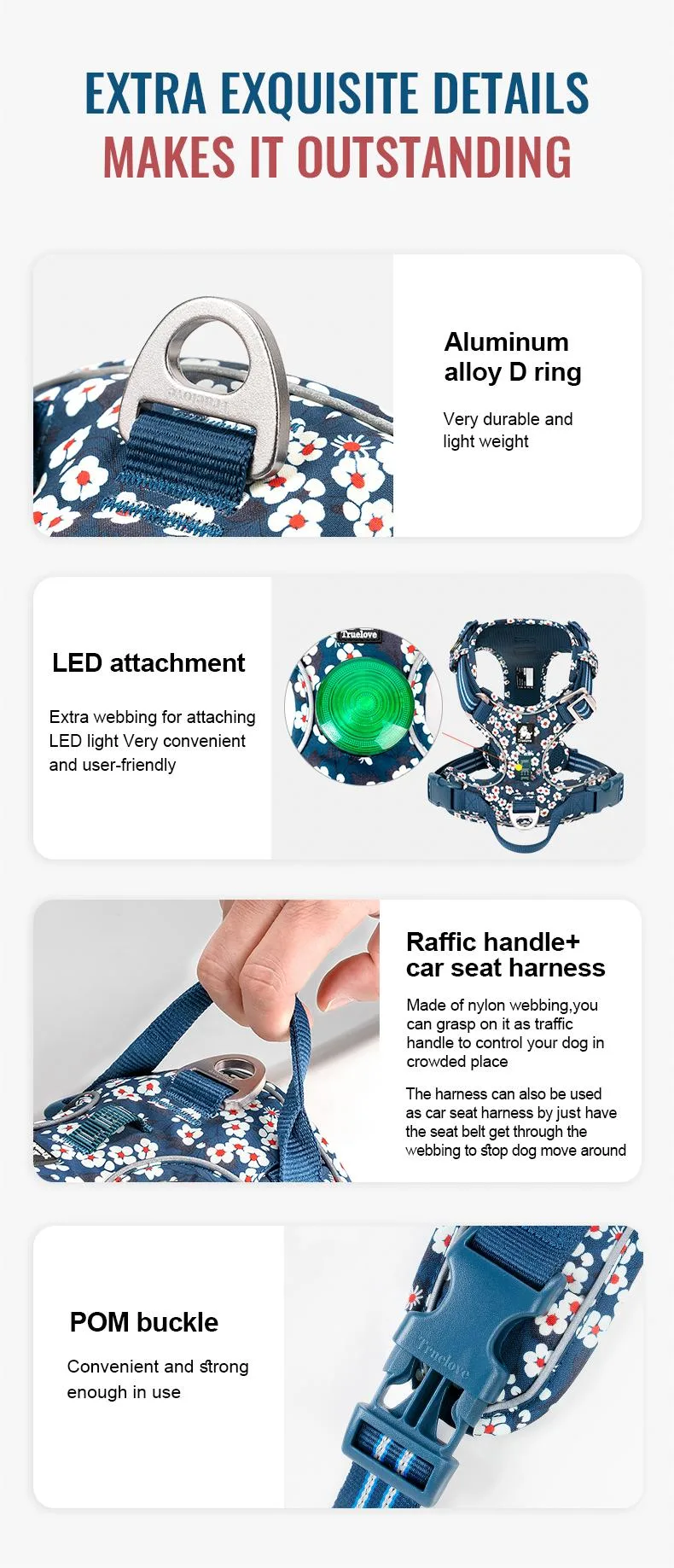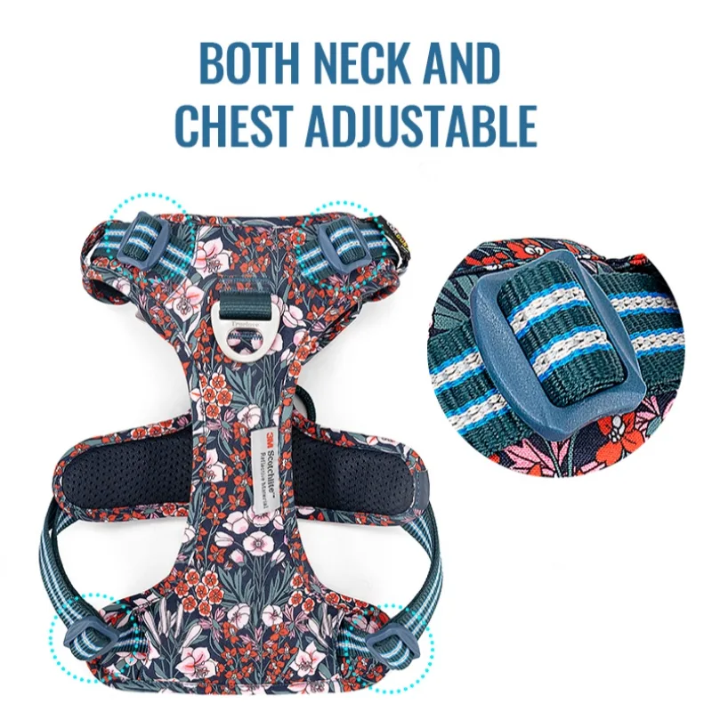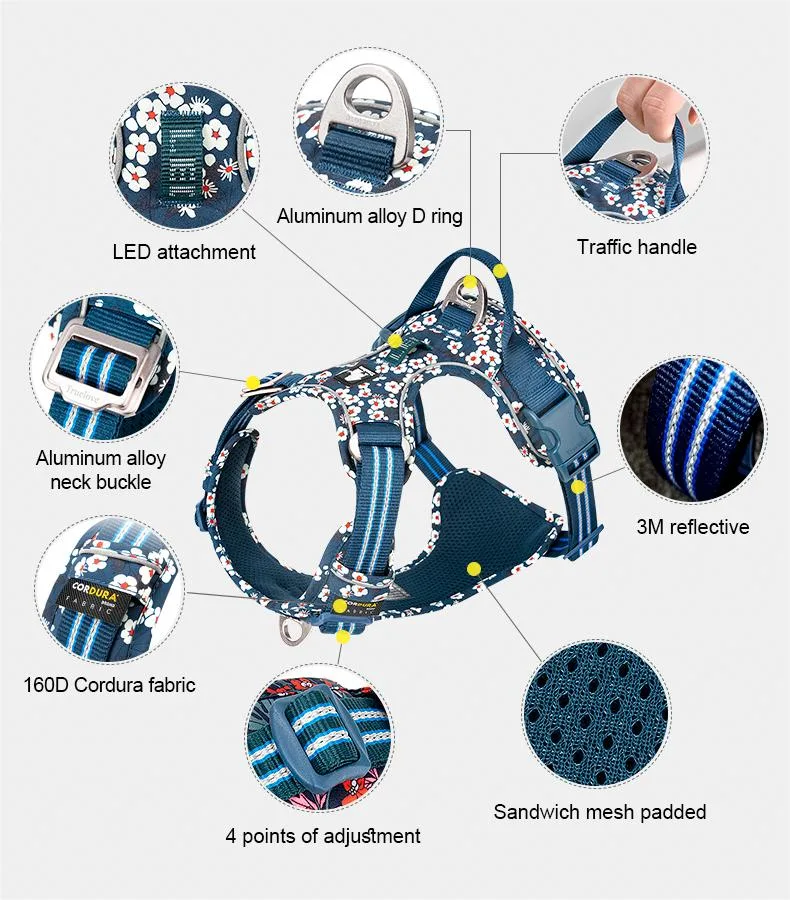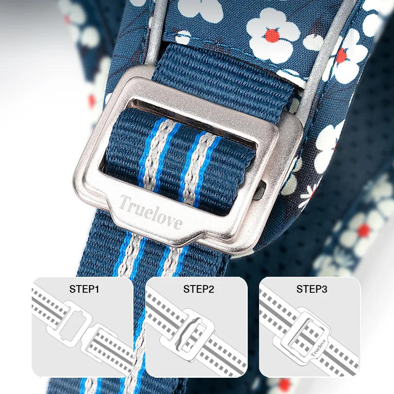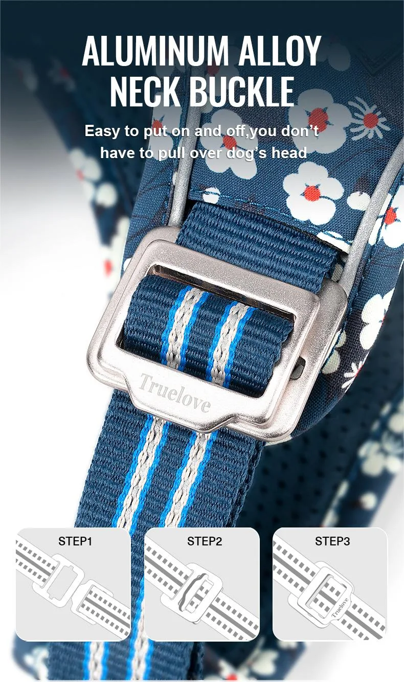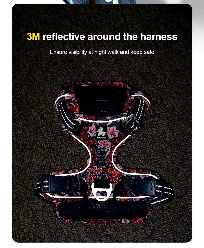 Introducing the Truelove TLH5656, an exceptional outdoor pet harness designed for durability, comfort, and functionality. Crafted from DuPont Cordura fabric with a unique pattern, this harness is built to withstand the rigors of daily use. The soft mesh padding inside ensures a comfortable experience for your pet. Featuring high-quality nylon buckles and high-density nylon webbing with 3M reflective material, this harness enhances visibility and safety during nighttime walks. The aluminum alloy D-rings on the front and back provide versatile leash attachment options, with the front D-ring designed to stop pulling. The quick-release buckles on the chest and neck make it easy to put on and take off. The Truelove TLH5656 harness is the perfect choice for pet owners who prioritize durability, comfort, and safety for their outdoor adventures.