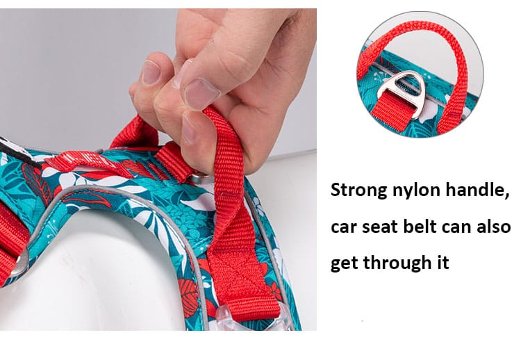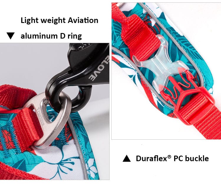 TLH5653 dog harness. Its inner material is made of breathable air mesh, which is soft and comfortable for your dog to wear. For added safety during nighttime walks, high-density nylon webbing with 3M reflective material improves visibility. The harness features Duraflex® buckle on both sides with large loading capacity, which greatly improves tensile strength. Plus, lightweight aviation aluminum fittings on the neck strap make it easy to put on and take off the harness, providing a new and more convenient experience for both you and your furry friend.