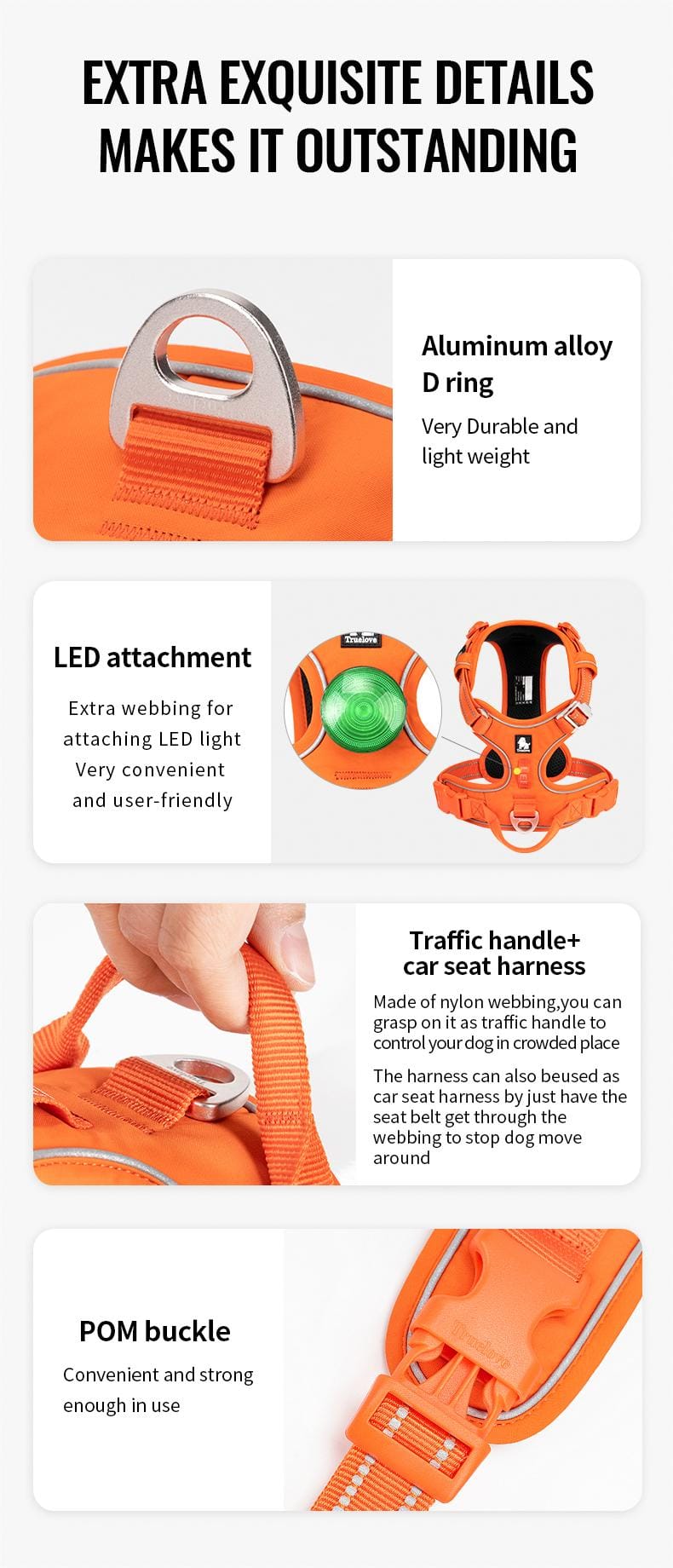 Introducing the Truelove TLH5654, an advanced outdoor pet harness designed for maximum comfort, durability, and safety. Constructed with 160D CORDURA fabric and a mesh lining, this harness is soft, durable, and abrasion-resistant. The 3M reflective straps provide exceptional visibility at night, ensuring your pet’s safety in low-light conditions. An aluminum alloy neck buckle allows for easy wearing and removal, while lightweight and durable aluminum alloy leash clips offer secure attachment points. For added convenience, an optional LED light can be added to enhance nighttime visibility. The Truelove TLH5654 harness is the perfect choice for pet owners seeking a high-quality, reliable, and safe harness for their outdoor adventures.