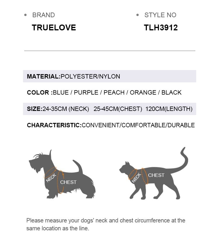 Truelove TLH3912 cat harness is made with durable polyester webbing in various colors and features lightweight aluminum alloy fittings for convenience. The Duraflex® PC buckle on both sides has a large loading capacity that greatly improves tensile strength. The harness comes with a matching durable leash to keep your cat safe while walking outdoors. Both the neck and chest are adjustable for a comfortable and secure fit.