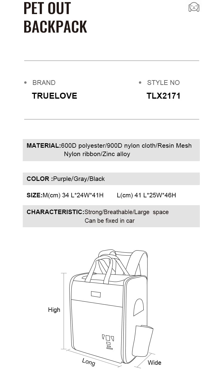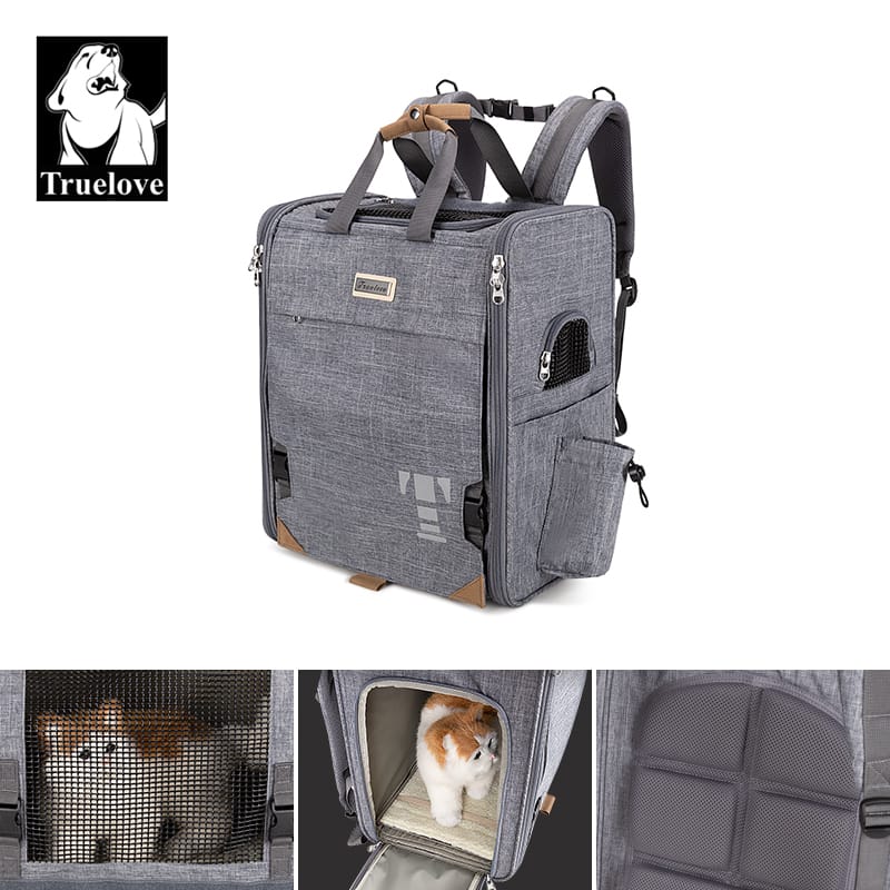 Truelove TLX2171 This pet backpack is designed for maximum comfort and ventilation, with two quick access openings on both sides. It also features a high visibility logo, breathable wide resin mesh, sun cover, convenient pockets, and secure attachment rings for added safety during travel.